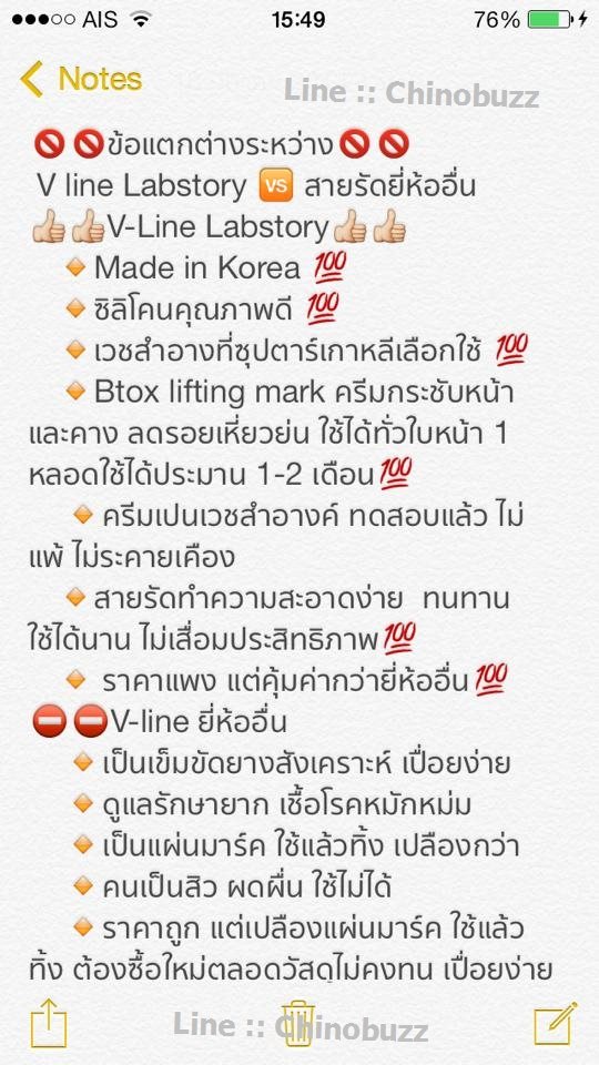 **พร้อมส่ง**Labstory V-Line B-tox Lifting Mask เวชสำอางอันดับหนึ่งที่ซุปเปอร์สตาร์เกาหลีมั่นใจเลือกใช้ นวัตกรรมใหม่แห่งการยกกระชับหน้าและคาง สู่หน้าเรียวเล็กโดยไม่ต้องพึ่งศัลยกรรม สายยกกระชับหน้าผลิตจากซิลิโคนคุณภาพ ปลอดภัยกับผิว ช่วยยกกระชับหน้าและคาง ***Made in Korea*** “แล็ปสตอรี่” เวชสำอางอันดับหนึ่งที่ซุปเปอร์สตาร์เกาหลีมั่นใจเลือกใช้ ขอแนะนำนวัตกรรมใหม่แห่งการยกกระชับหน้าและคาง สู่หน้าเรียวเล็กโดยไม่ต้องพึ่งศัลยกรรม กับแล็ปสตอรี่ วี ไลน์ บี-ท็อคซ์ ลิฟติ้ง มาสค์ สายยกกระชับหน้าผลิตจากซิลิโคนคุณภาพ ปลอดภัยกับผิว ช่วยยกกระชับหน้าและคางทำให้หน้าเรียว และทำให้รอยเหี่ยวย่นช่วงลำคอดูตึงและตื้นขึ้น มาสค์ทิ้งไว้อย่างน้อย 15 นาที แล้วเอาออก ควรใช้ต่อเนื่อง อย่างน้อย 2 ครั้งขึ้นไป ต่อสัปดาห์ ทำความสะอาดสายรัดด้วยน้ำสะอาดแล้วตากไว้ให้แห้ง -----------------------------