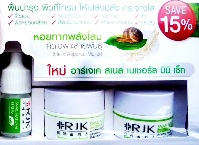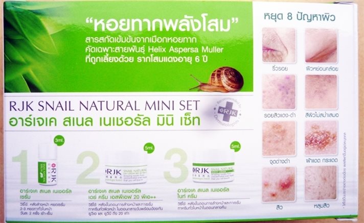 ความพิเศษที่แตกต่างจากครีมทั่วไป ความพิเศษของผลิตภัณฑ์อาร์เจเค สเเนลเซ็ต เป็นผลิตภัณฑ์ที่ผลิตและสกัดจากเมือกหอยทาก ที่คัดเฉพาะสายพันธ์ เฮลิกซ์ แอสเพอร์ซ่า มัลเลอร์ ที่เป็นหอยทากที่มีเมือกพิเศษ และเป็นหอยทากที่ถูกเลี้ยงด้วย รากโสมแดงซึ่งมีอายุ 6 ปี ซึ่งหลายๆคนทราบดีอยู่แล้วว่าเมือกหอยทากเป็นสารอาหารที่ให้คุณค่าโปรตีนแก่ผิวและเป็นไฮยาลูลอนนิกซ์ธรรมชาติที่ดีที่สุด ประกอบกับรากโสมอันเลื่องชื่อของประเทศเกาหลีที่ใช้สำหรับเลี้ยงหอยทากชนิดนี้ จึงทำให้ได้เนื้อครีมที่ทรงประสิทธิภาพสูงสุด เพราะไม่เพียงแต่แก้ปัญหาในด้านพื้นฐานของผิวให้เรียบเนียน แต่ยังช่วยในเรื่องของความกระจ่างใสได้อีกด้วย ไม่ใช่เรื่องง่ายที่จะสามารถนำรากโสมที่ปลูกด้วยวิธีธรรมชาติ 6 ปี มาใช้เลี้ยงหอยทากแล้วนำเมือกหอยทากมาสกัดเป็นผลิตภัณฑ์ เพื่อการแอ๊คทีฟด้านผิวพรรณสูงสุดจึงต้องคัดเลือกพันธ์หอยทากที่มีเมือกเป็นกรดไฮยาลูลอนนิกส์ที่มีความเข้มข้นสูงทึ่สุดที่พอจะสามารถผลักโปรตีนเข้าสู่ผิว พร้อมกับการบำรุงและปรนิบัติผิวจากสารสกัดของรากโสมแดงไปในตัว นี่จึงเป็นความพิเศษของผลิตภัณฑ์เวชสำอางค์สัญชาติเกาหลีนี้เฉพาะอาร์เจเคเจ้าเดียวเท่านั้น คำถามที่พบบ่อย