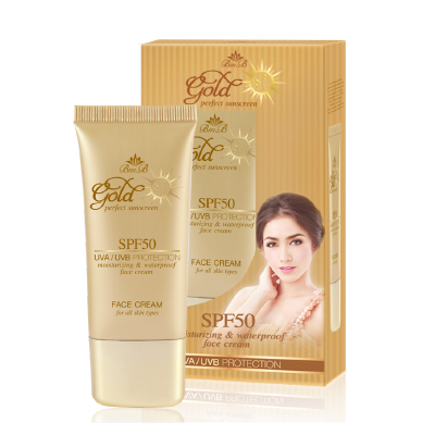 ผลิตภัณฑ์ครีมกันแดดผสมทองคำบริสุทธิ์ เนื้อเนียนนุ่ม บางเบา เกลี่ยง่าย พร้อมคุณสมบัติกันน้ำ กันเหงือ ปกป้องผิวจากรังสี UVA , UVB ด้วยค่า SPF 50 อันเป็นสาเหตุหนึ่งของการเกิดฝ้ากระ จุดด่างดำ และริ้วรอยหมองคล้ำ ทองคำแท้บริสิทธิ์ช่วยปรับสภาพผิวและชะลอความเสื่อมสภาพของเซลล์ผิว ช่วยให้ผิวแลดูกระจ่างใส